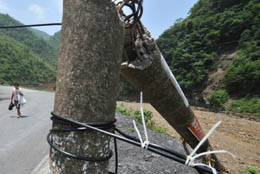 5月31日,一位村民從被洪水沖毀的電力、通訊設施旁走過。