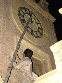 日前,巴基斯坦全國調整時間,將時鐘撥快一小時,商店也提早關門。政府采取這一舉措,是為了節約用電,以應對嚴重的電力短缺。圖為在巴基斯坦的海得拉巴,一名男子用竹竿調整鐘樓上時鐘的指針。