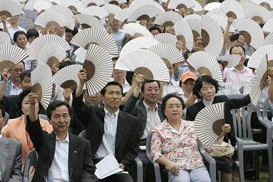19日,在韓國首都首爾的市政廳大廈,人們手舉紙制扇子,表示對節能運動的支持。新華社/路透