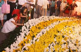 6月24日,圖片展入口處堆滿了觀展的市民獻上的菊花。6月19日在上海展覽中心開幕的“抗震救災 眾志成城——2008中國抗震救災大型新聞圖片巡回展”吸引了眾多申城市民前往參觀。截至6月24日16時,觀眾總數已達到11.5萬人。