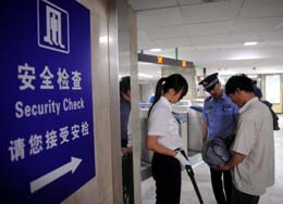 6月29日,安檢人員在北京地鐵崇文門站對乘客所攜物品進行人工檢查。據北京地鐵運營公司介紹,為了維護北京地鐵的公共秩序,保障奧運會的順利舉行,北京從6月29日至9月20日對乘坐軌道交通的旅客所攜帶的物品實施安全檢查。檢查的重點放在對攜帶槍支彈藥、管制刀具、易燃易爆及放射性、毒害性等可能影響公共安全的物品進行檢查。北京地鐵在運線路所有車站站廳的檢票口前設置安檢設備,并在醒目位置張貼禁止乘客攜帶的具體物品目錄。