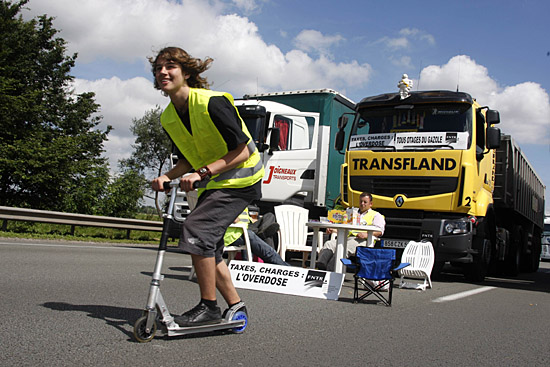 6月30日,在法國北部的法朗潘,一名少年蹬著滑板車從堵塞公路的卡車旁經過。當天,法國大批卡車司機在法國多個城市以堵塞道路的方式抗議油價上漲,并要求政府支持運輸行業。新華社/路透