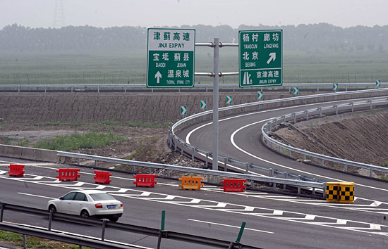 7月2日,一輛小轎車從京津高速和津薊高速公路的互通處駛過。目前,京津高速公路主線道路工程即將實現全線通車。京津高速公路北起北京朝陽區西直河,終點到達天津塘沽區,全長184.4公里。