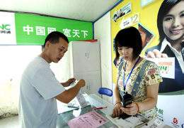 7月5日,在四川都江堰市幸福家園安置點,顧客在活動板房內的網通應急營業廳辦理業務。搶通修復因災損毀的供水、道路、電力、通信等基礎設施,對抗震救災的順利開展至關重要,也是災后重建和恢復生產的重要前提。記者采訪了解到,目前四川地震災區水、電、路和通信等基礎設施基本恢復。