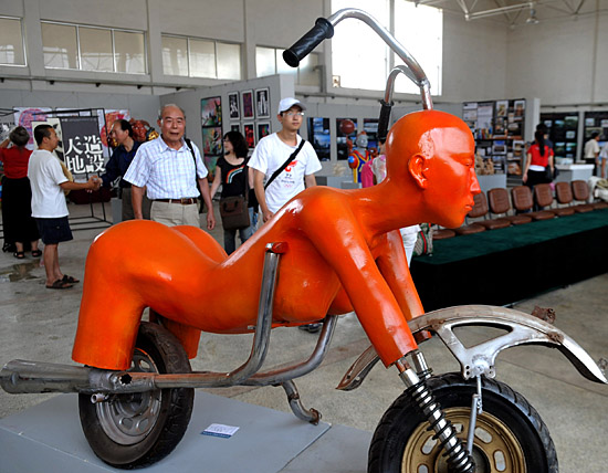 7月8日,參觀者從一件運動創意作品前走過。北方民族大學設計藝術學院2008屆畢業生的200多件優秀展覽作品,從視覺傳達、環境藝術、公共藝術、油畫等方面反映了當今藝術的多元化,令參觀者好奇不已。