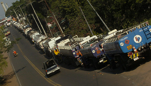 15日,在巴拉圭首都亞松森,各加油站的運油車在巴拉圭國家石油公司門外排起長隊。國際油價的大幅上漲使得石油嚴重依賴進口的巴拉圭面臨能源危機,巴拉圭國家石油公司至今仍拖欠外國石油公司3.2億美元費用,國內成品油供應不足。目前該國近三成公交車和出租車因缺油無法工作,正值收割季節的農業部門也因為燃油供應不足而蒙受損失。