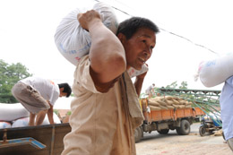 河南種糧農民爭售新糧。6月10日,周口市東郊國家糧食儲備庫工人往糧倉里運新糧。 眼下,河南省小麥收割基本結束,全省各地糧食收購部門按國家制定的收購價敞開收購,廣大糧農積極踴躍出售新糧。新華社發(楊正華