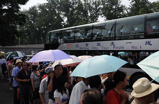 7月20日,乘客在觀光專線的北官廳站排起長隊等待乘車。當日,北京開通兩條奧運觀光專線,供國內外游客奧運期間游覽奧運場館和北京市內的名勝景點。