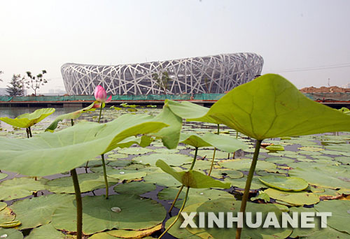 6月28日,國家體育場“鳥巢”南側人工湖里的荷花含苞待放。20余天前,人工湖里栽下的睡蓮、菖蒲等10余種植物長勢良好。 新華社記者 邢廣利