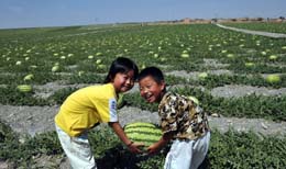7月23日,寧夏中衛市沙坡頭區興仁鎮兩名小朋友抱起一個硒砂瓜。