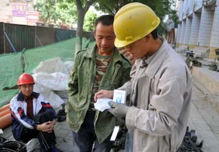 兩位在寧夏銀川市興慶區進寧街工地上干活的農民工正在仔細觀看“勞動合同法撲克”。5月31日,銀川市興慶區職工幫扶救助中心正式成立,工作人員立即將印有“勞動合同法”的撲克發放給附近的農民工,旨在讓更多農民工了解勞動合同法,合理合法保護自身權益。新華社記者:武勇 攝 |