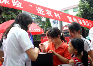 2008年6月27日,福建省一些保險公司的工作人員正在向閩清縣白樟鎮的居民介紹保險知識。當日,福建保監局、福建省保險學會、福建省保險行業協會及9家保險公司共120多人在白樟鎮開展了“保險進農村”宣傳活動。新華社記者:康淼