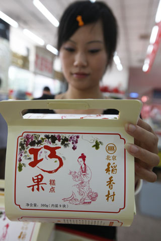 7月30日,一名顧客在北京一家稻香村連鎖店內選購“巧果”。