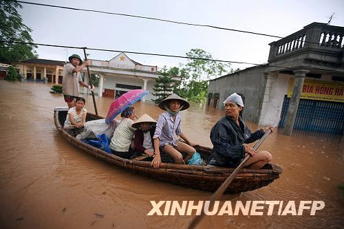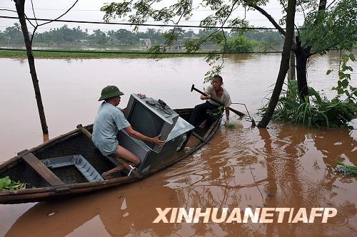 8月9日,在越南富壽省的夏和地區,當地民眾乘坐小船離開被洪水淹沒的村莊。新華社/法新