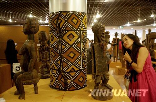 8月9日,參觀者在展覽上觀看非洲木雕藝術作品。當日,非洲古文明展《遠古的凝視》在北京橋藝術中心開展,共展出非洲木雕、象牙雕,陶塑、織品和皮革藝術等300余件非洲古代藝術品。