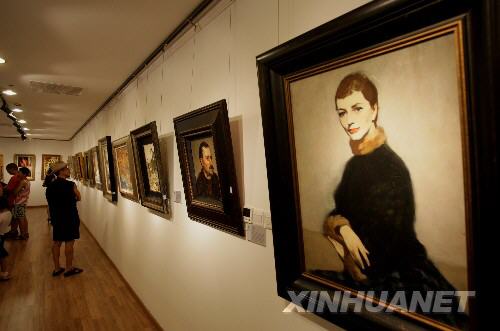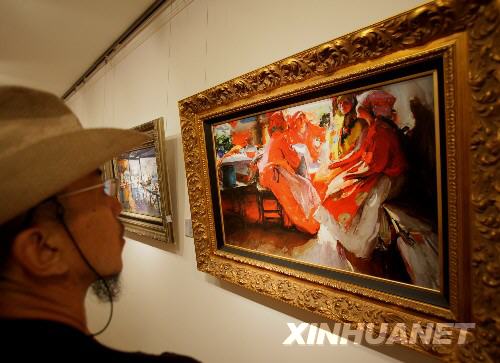 8月9日,參觀者在觀看繪畫作品。 當日,俄羅斯繪畫大師精品展在北京橋藝術中心開幕。近百幅俄羅斯繪畫大師的油畫作品參展。