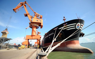 8月13日,一艘外籍貨輪?繗J州港勒溝作業區卸貨。據南寧海關統計,2008年上半年廣西北部灣經濟區進出口29.9億美元,同比增長83.3%。防城港、南寧、欽州三市分別以12億美元、8.7億美元、6.2億美元位列經濟區進出口前三,其中欽州增速最快,達1.2倍。