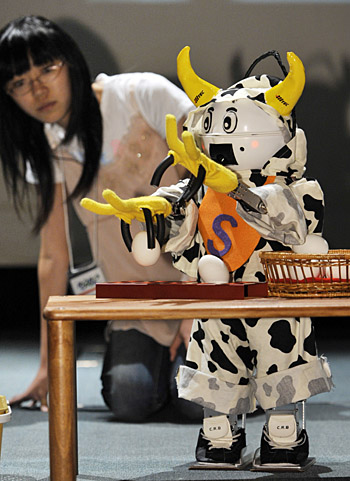 17日,在日本神奈川縣舉辦的家務機器人競賽預賽上,一個機器人從籃子里撿起雞蛋擺放到架子上。15個家務機器人參加了這次預賽。新華社/法新