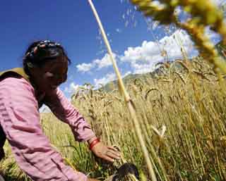 8月23日,西藏拉薩市城關區蔡公堂鄉的農民在收割小麥。近年來,西藏進一步加大農業投入,優化種植結構,增加優質品種、經濟作物種植比例。目前,各地進入收割階段,農村開鐮收割。
