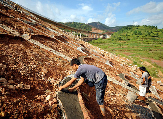 8月27日,建筑工人在修建岑溪至興業高速公路路基加固墻。未來5年,廣西將投資超過1200億元建設一批連通周邊國家和鄰省的高速公路。項目建成后,從南寧到長沙只需9小時,到昆明只需8小時,到廣州僅需6個小時。