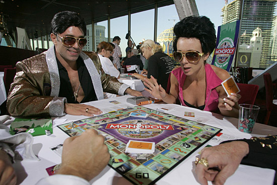 27日,在美國內華達州的拉斯維加斯,幾名玩家裝扮成明星模樣玩起“大富翁”游戲。27日格林威治標準時間14點,在倫敦、馬德里、東京、東朗梅多等20多個城市,玩家們同時展開“大富翁”游戲活動,力爭創下最多人同時進行“大富翁”游戲的吉尼斯世界紀錄。新華社/路透
