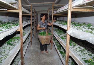 江西萬年大力發展蠶桑產業。目前全縣桑園面積已發展到9000畝,養蠶農戶達7000多戶,并全部實現手持訂單生產。8月30日,上坊鄉港邊村技術工人郝國珍在喂養桑蠶。新華社發(周科