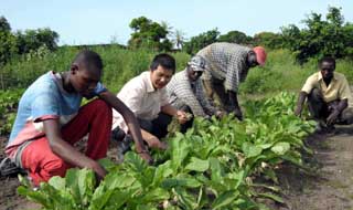 9月6日,在塞內加爾首都達喀爾遠郊的中國蔬菜種植示范園,農藝專家盧永剛(左二)指導當地農民蔬菜種植技術。從2005年開始,十多名來自中國的農業技術專家在西非之角的達喀爾遠郊設立一片占地1.3公頃的中國蔬菜種植示范園。經過2年多耕耘,示范園已經成功培育蔬菜30余種,培訓當地農業技術人員3190余人。