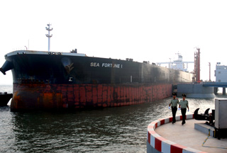 河北省唐山港曹妃甸中石化石油碼頭日前開航。曹妃甸中石化30萬噸級石油碼頭自2006年11月開工建設,2008年7月竣工。碼頭最大可靠泊45萬噸級油輪,接卸原油能力最大可達每小時1.2萬立方米。圖為河北邊防干警在曹妃甸原油碼頭巡邏。