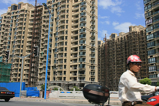 一位上海市民騎車從上海中心城區某新建商品樓前經過(9月9日攝)。上海佑威房地產研究中心9月10日發布的最新報告顯示,2008年上海樓市調整過程中,已有44.8%的新樓盤平均成交價格出現下跌。