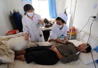 9月18日,尋甸縣人民醫院護士為中毒人員測量心率。
