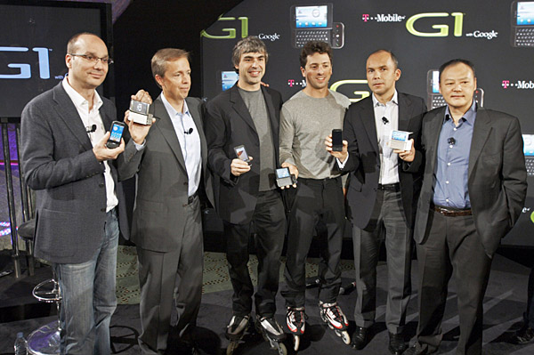 23日,在美國紐約,來自谷歌、德國電信和旗下移動服務提供商T-Mobile以及生產商臺灣宏達電的高層人員一同展示首款谷歌Android操作系統智能手機T-Mobile G1。當天,首款谷歌Android操作系統手機在紐約正式發布。據悉,這款智能手機將于10月22日正式上市,售價179美元(約合人民幣1220元)。新華社/路透