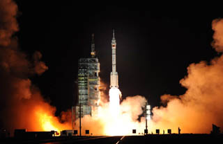 21時10分,隨著一聲“點火”的口令,承載著神舟七號載人飛船和3名航天員的火箭,在震天的轟鳴聲中騰空而起,飛向茫茫太空,在夜色中劃出一道耀眼的軌跡。