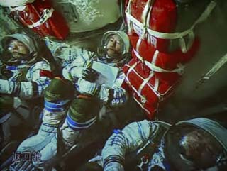 三位宇航員在起飛后的神舟七號載人飛船上。新華社記者:查春明 攝