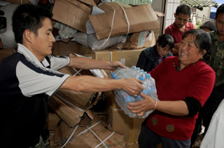 9月25日,群眾在北川縣任家坪村領取飲用水。由于連日降雨,四川省北川縣許多地方遭遇泥石流襲擊。當地政府緊急轉移受災群眾,并向他們提供食物、飲用水、帳篷等物資。