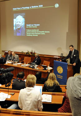 10月6日,瑞典卡羅林斯卡醫學院在斯德哥爾摩宣布,將2008年諾貝爾生理學或醫學獎授予德國科學家哈拉爾德·楚爾·豪森及兩名法國科學家弗朗索瓦絲·巴爾-西諾西和呂克·蒙塔尼。大屏幕上顯示的是德國科學家哈拉爾德·楚爾·豪森的照片。