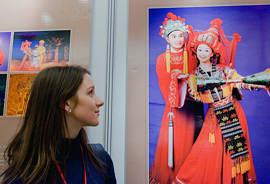 7日,在位于比利時布魯塞爾的歐洲議會,一名工作人員參觀中國圖片展。由廣西桂林市政府主辦、歐洲議會協辦的“美麗桂林”圖片展當晚在歐洲議會開展。