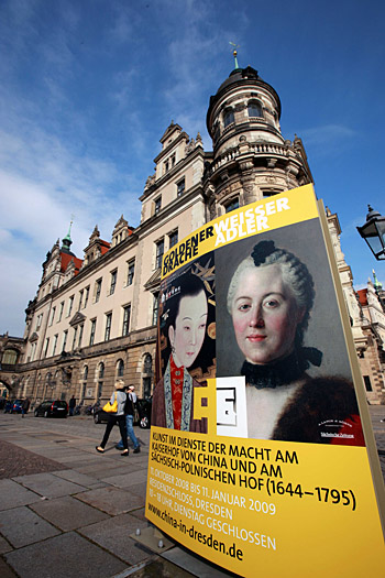 10日,《金龍與白鷹》中德宮廷藏品展的宣傳海報豎立在德國東部城市德累斯頓王宮前。當天,《金龍與白鷹》中德宮廷藏品展向媒體開放,本次展覽為期3個月,是今年德累斯頓“中國年”的壓軸節目。展覽展出了中國清朝皇宮和德國薩克森選帝侯王宮收藏的繪畫和工藝珍品約400件,由德國德累斯頓國家藝術館和中國故宮博物院共同主辦。雙方提供的展品包括繪畫、瓷器、宮廷家具等,以相互比較的方式同室展出。