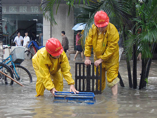 10月14日,兩名市政工人在?谑旋堌S路口疏通下水管道并設置標識,以防行人不慎跌入。