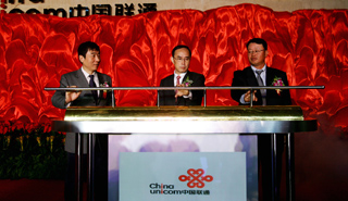 10月15日,工業和信息化部副部長奚國華(左)、中國聯合網絡通信有限公司籌備組組長常小兵(中)和國務院國有資產監督管理委員會副主任孟建民在揭幕儀式上。