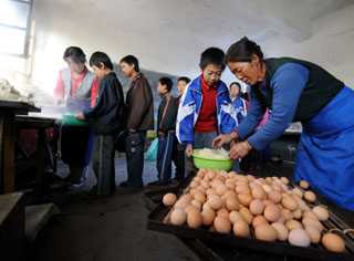 靜樂縣段家寨中心小學的學生正在領取雞蛋。