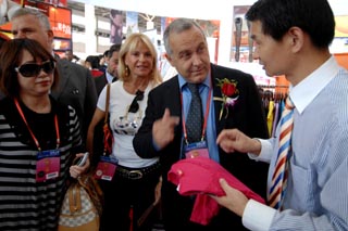 10月21日,中國義烏浪莎企業的營銷人員正在向意大利商人推薦新產品。