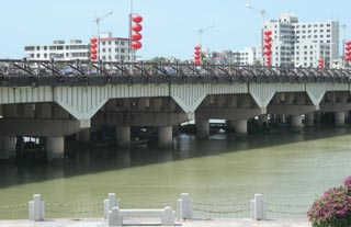 自2007年11月被權威部門檢測為危橋的海南省三亞市三亞大橋至今仍“帶病服役”。三亞大橋建于20世紀60年代,連接三亞東西城區主干道,車流量極大,負荷高,一些船舶違規停在橋墩下,不少行人和車輛仍進入橋梁被封閉的禁行區,安全隱患重重。2008年1月17日,三亞市政府通過三亞大橋拆除重建方案,但是據三亞規劃局的消息,該方案要等到三亞河上的新風橋重建完工后才能正式上馬,至少需要再等1年時間。