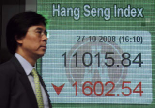 10月27日,一名市民從香港中環的顯示恒生指數的電子屏幕前走過。
