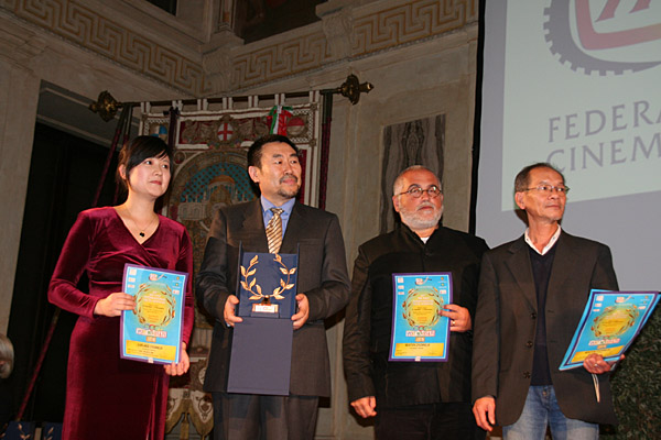 5日,中央新聞紀錄電影制片廠廠長高峰(左二)與影片導演顧筠(左一)在頒獎現場。當日,第26屆國際體育電影電視周在意大利米蘭落幕。由北京奧組委新聞宣傳部監制、中央新聞紀錄電影制片廠拍攝制作的奧運紀實電影《筑夢2008》,獲本屆電視周的報道紀錄片單元的最佳影片“榮譽花環”獎和特別獎項中的影評獎。新華社發