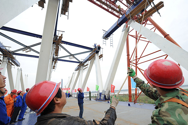 11月6日,中鐵大橋局的建設者在鄭州黃河公路鐵路兩用橋上架設鋼梁。當日,鄭州黃河公路鐵路兩用橋開始架設鋼梁,這標志著大橋工程的控制性節點工作全面展開。鄭州黃河公路鐵路兩用橋是京廣客運專線和公路大橋跨越黃河的共用橋梁,公路鐵路采用上下兩層分布,合建部分全長9177米,工程將于2010年7月完工。