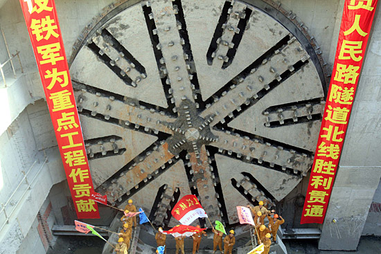 11月9日,上海建工基礎公司的建設者在人民路隧道浦西接收井慶賀隧道北線貫通。當日,2010年上海世博會配套項目之一的黃浦江又一條越江隧道——人民路隧道江中段北線貫通。人民路隧道全長3097米,計劃2009年通車。新華社發