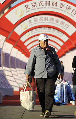 11月13日,一位觀眾提著資料走出北京展覽館。當日,第四屆北京國際金融博覽會在北京展覽館開幕,本屆博覽會會聚國內百余家銀行、基金、證券、保險等金融機構,近千種金融理財產品在博覽會上集中展示。