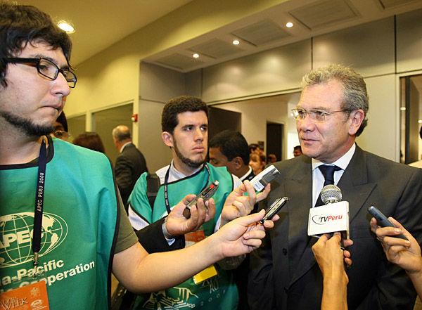 16日,在秘魯首都利馬,秘魯外交部副部長岡薩洛·古鐵雷斯(右)在亞太經合組織(APEC)高官會議召開前接受采訪。當天,APEC21個成員的高官齊聚秘魯國家博物館,就世界經濟和金融形勢、支持世界貿易組織多哈回合談判、亞太地區經濟一體化等議題交換意見。高官會議的召開標志著本屆APEC領導人會議周正式拉開帷幕。