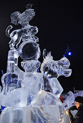 18日,在德國北部城市不來梅,一名俄羅斯藝術家在雕刻童話《不來梅的音樂家》的冰雕作品。大約40名雕刻者創作了28尊以格林童話為主題的冰雕作品。新華社/法新