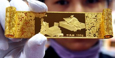寧夏珠寶城出售的千足金“中國古代四大發明”——造紙術(11月23日攝)。